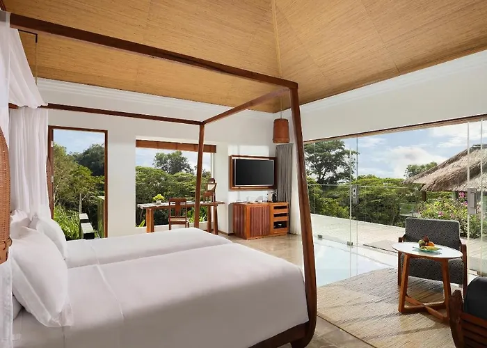 Viceroy Bali is set on a ridge overlooking the Valley of the Kings. Its villas come with private pools and stunning views. The hotel features two on-site restaurants and a spa that provides extensive wellness treatments. Its proximity to Ubud's cultural sites allows for easy exploration of the local heritage.
